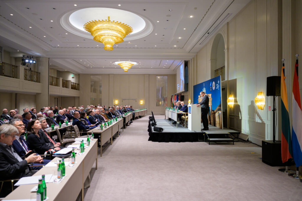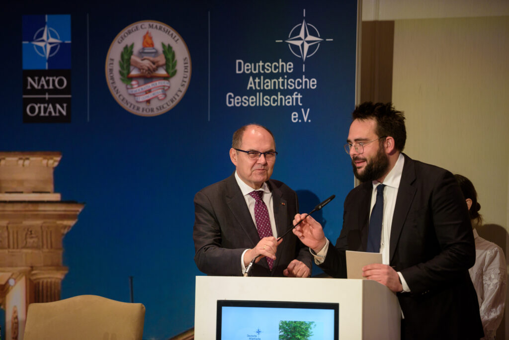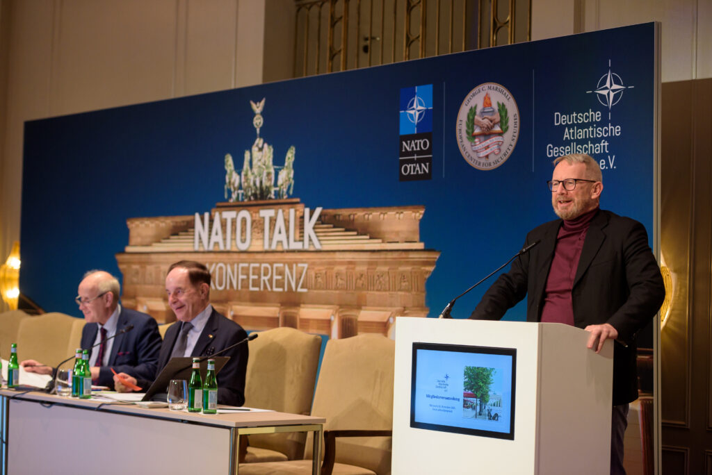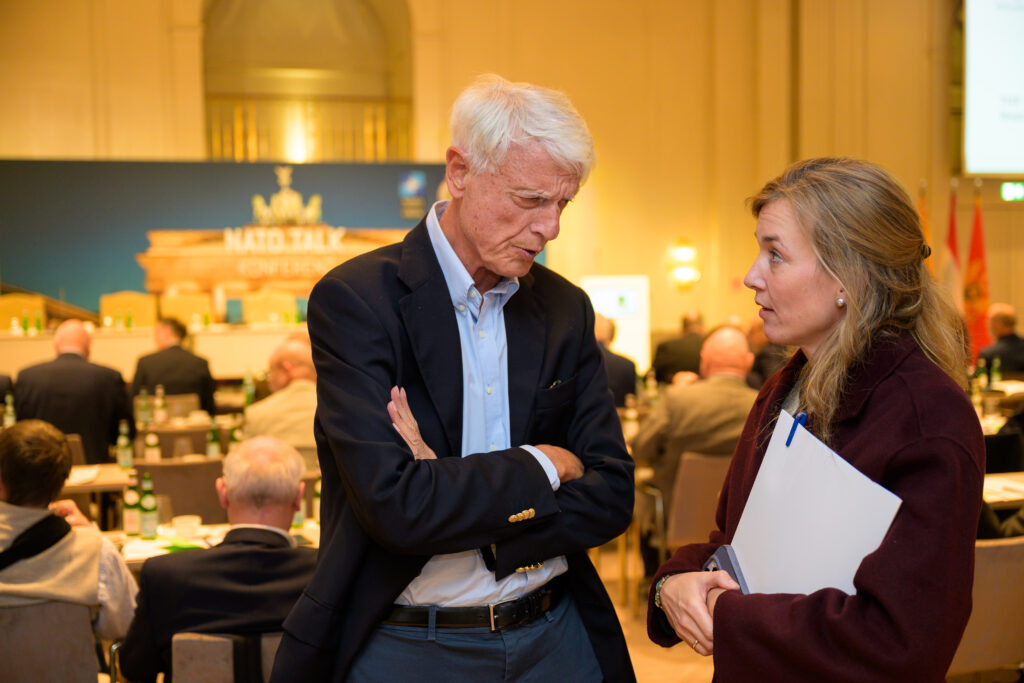 In seiner Begrüßung verwies Schmidt auf die sicherheitspolitisch herausfordernden Zeiten, in denen die Arbeit der Deutschen Atlantischen Gesellschaft an Bedeutung gewinne. Der Ballsaal war gut gefüllt – auch, weil am darauffolgenden Tag die jährliche NATO Talk-Konferenz der Gesellschaft stattfand, die zahlreiche Gäste aus Politik, Wissenschaft und Diplomatie nach Berlin führte.